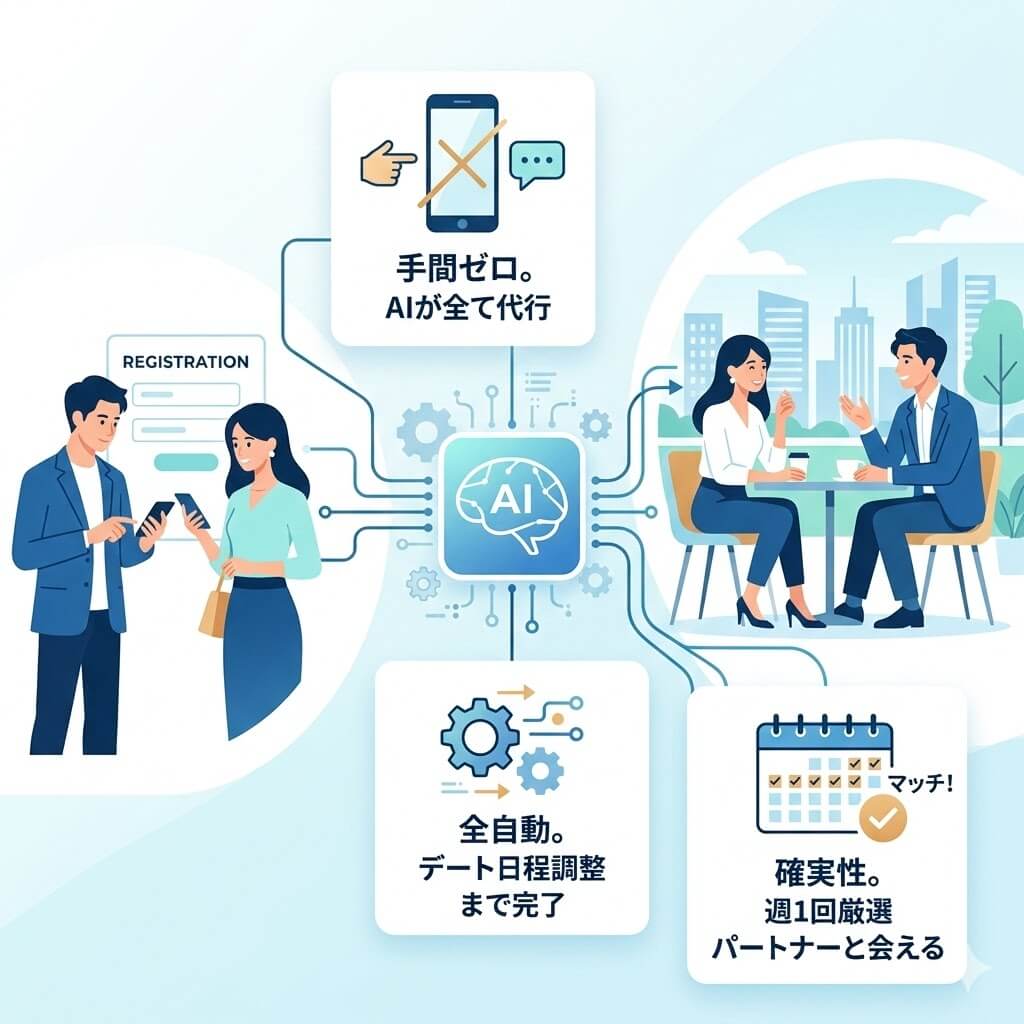 最大の利点は、マッチング後の不毛なメッセージのやり取りを一切排除できることです。通常、1人と会うまでに数十通のやり取りを数日間にわたって行う必要がありますが、バチェラーデートではその工程が100%カットされます。AIが日程調整まで完結させるため、通知を確認して当日現地へ向かうだけ。忙しい経営者や専門職の方にとって、これ以上のタイパ(タイムパフォーマンス)はありません。