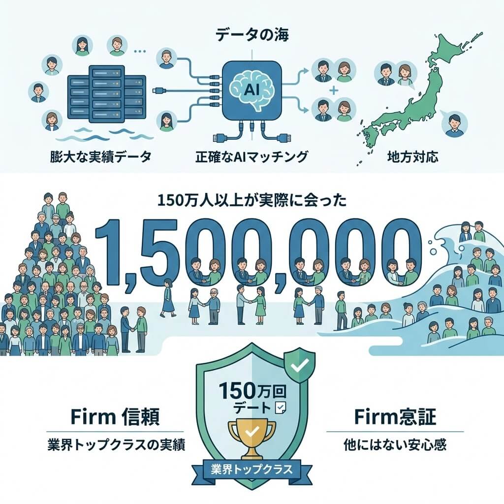 デーティングサービスの中でも、累計デート人数150万人突破という数字は業界トップクラスです。これは、単なるマッチング数ではなく「実際に会った数」である点が重要です。豊富なデータ量があるからこそ、AIの精度も高く、地方都市を含む幅広いエリアでのマッチングを可能にしています。実績に裏打ちされた安心感は、他サービスにはない強みです。