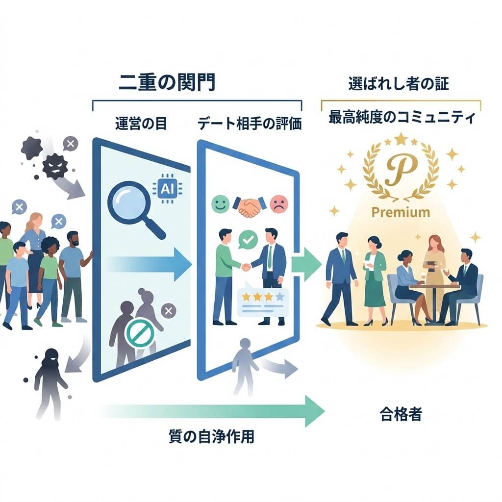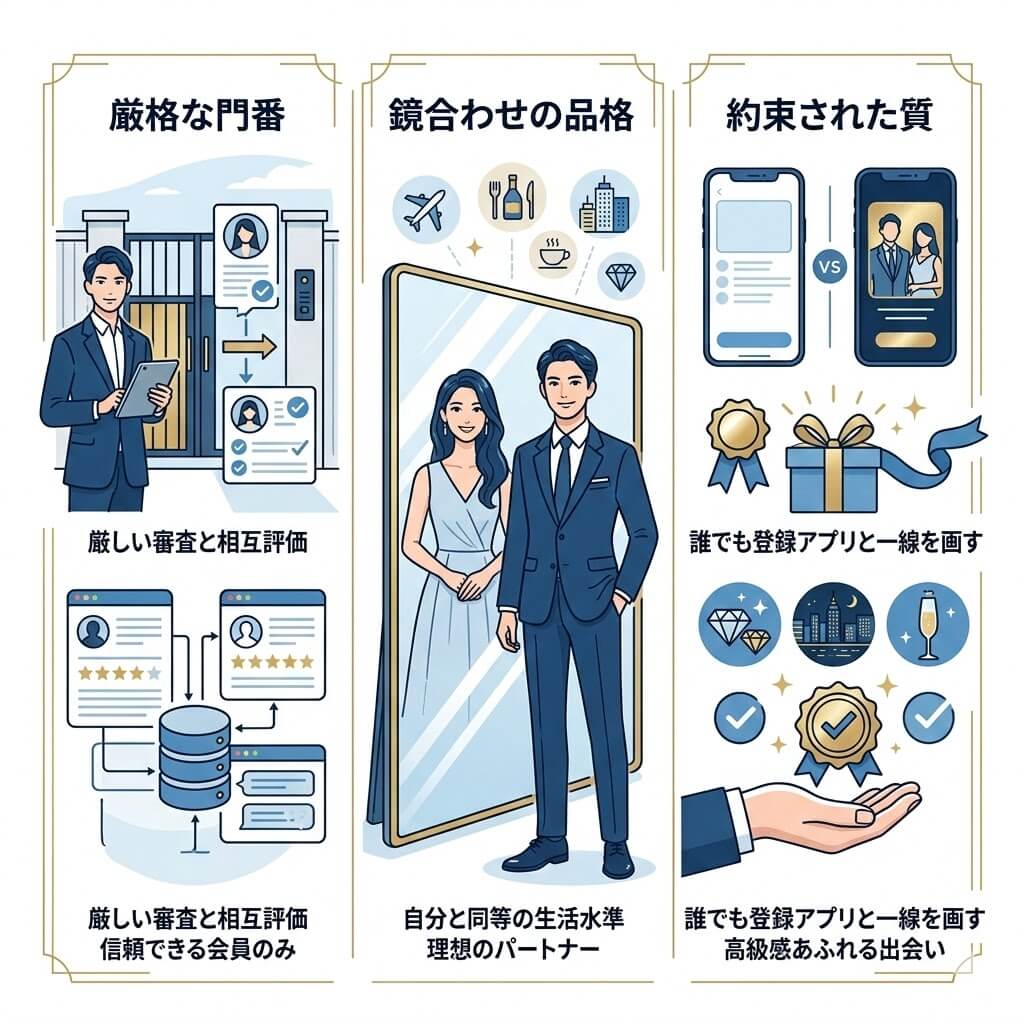 登録時の運営審査に加え、初回のデート後には相手からの評価に基づく「本合格」のステップがあります。この二段構えの審査により、マナーの悪いユーザーや、スペックを偽っているユーザーが淘汰される仕組みになっています。常に「選ばれた人だけがいる場所」であり続けることが、高水準な出会いを維持する秘訣となっています。
