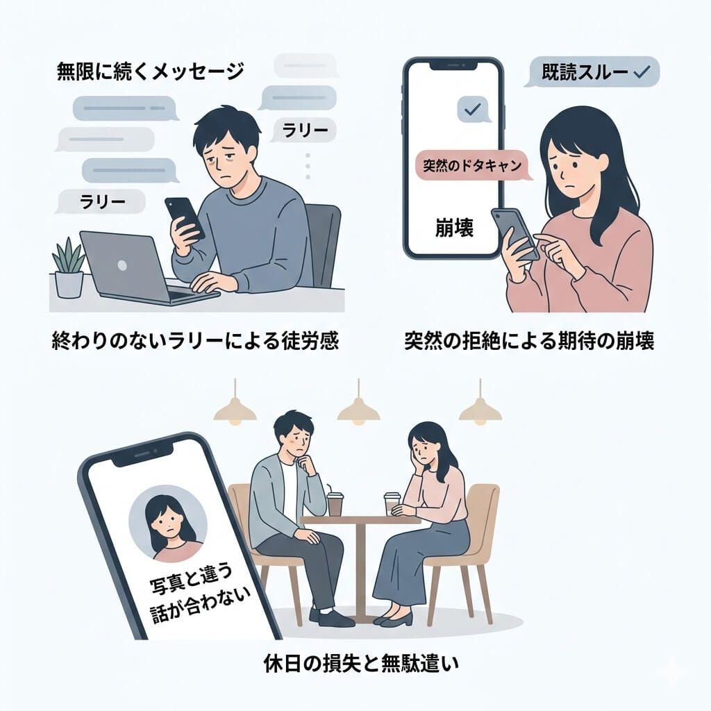 多くの人がマッチングアプリを利用しながらも、「出会う前段階」で疲れ果てています。気になる相手に「いいね」を送り、マッチングしても、そこから始まるのは終わりの見えないメッセージのやり取り。趣味や仕事の話を数日間続け、ようやく勇気を出して誘っても、返信が途絶えてしまう「既読スルー」や「ドタキャン」に心を削られた経験はないでしょうか。