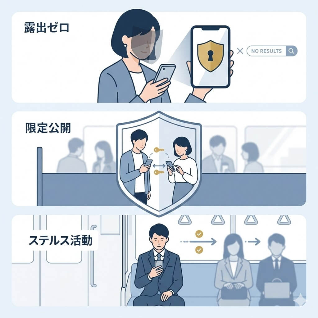 「アプリを使っていることを知人に知られたくない」という不安を解消するため、プロフィールはマッチングした相手以外には非公開となっています。不特定多数に自分の顔写真や経歴を晒される心配がないため、プライバシーを重視する方でも安心して活動できます。また、デート相手とも当日会うまで詳細なプロフィールは限定公開されるため、身バレリスクを最小限に抑えられます。