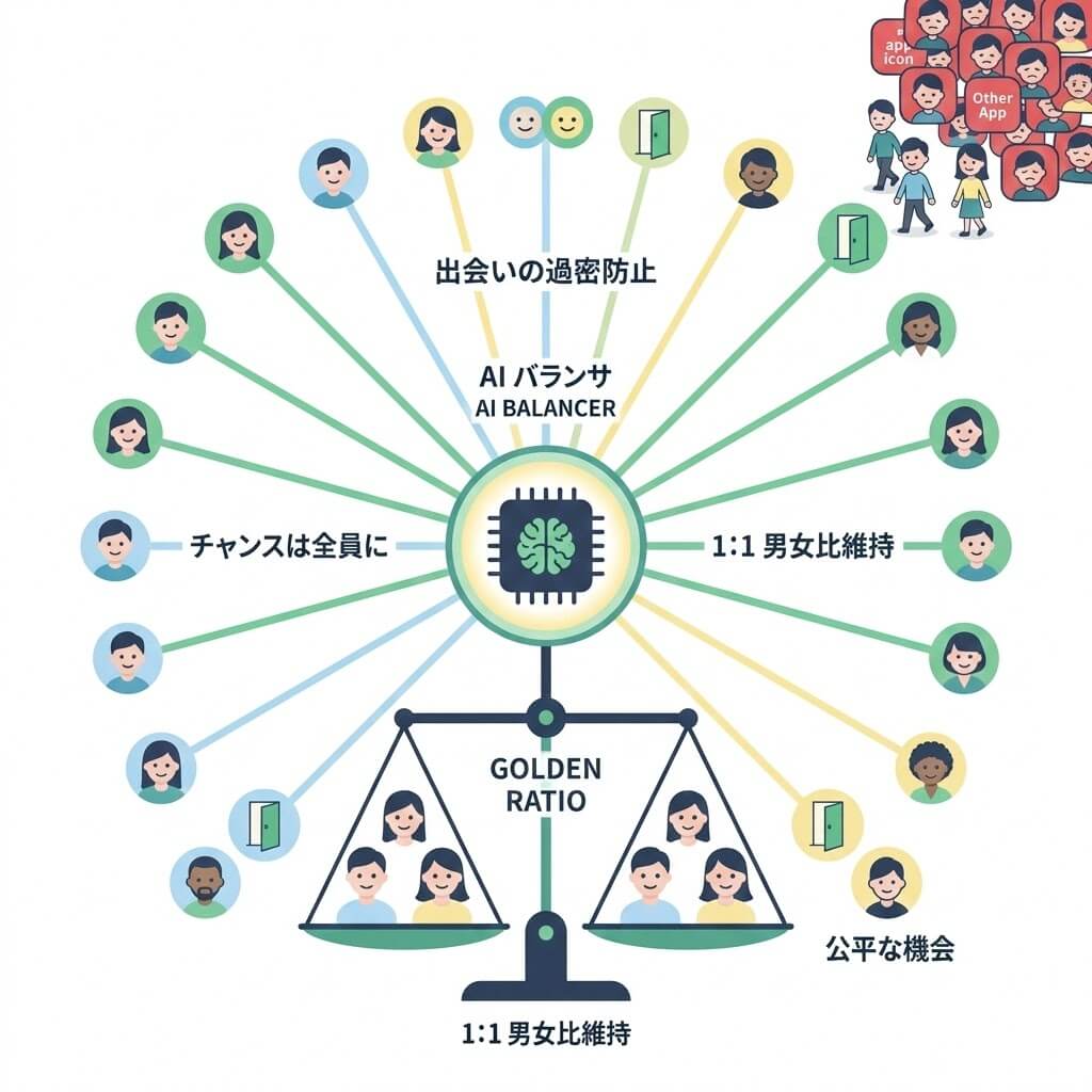一般的なマッチングアプリでは男性比率が高く、男性が苦戦するケースが多いですが、バチェラーデートはAIによる自動調整のため、アクティブユーザーの男女比が均衡に保たれています。これにより、「有料会員になったのに全く出会えない」という事態を防ぎ、全てのユーザーに公平なデート機会が提供される仕組みになっています。