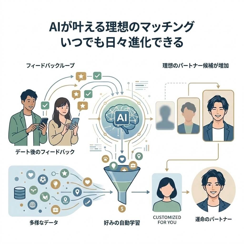 利用を重ねるごとに、AIがあなたの好みを深く学習していきます。デート後に相手を評価するシステムがあり、そのフィードバックが次回のマッチングに即座に反映されます。「次はもっと落ち着いた雰囲気の人がいい」「会話が弾む人がいい」といった細かな要望が、データ蓄積によって具現化され、回を追うごとに理想の相手に出会える確率が高まります。