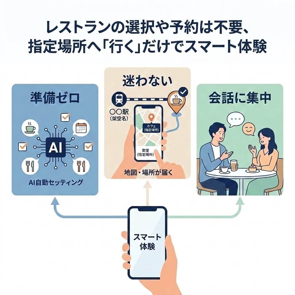 初対面のデートで悩みの種となる「お店選び」も、運営側が厳選したカフェやレストランを指定してくれます。主要駅近くの雰囲気の良い場所が自動的に設定されるため、店を探したり予約したりする手間が一切かかりません。お互いに「指定された場所へ行くだけ」という共通認識があるため、スムーズに待ち合わせができるよう設計されています。